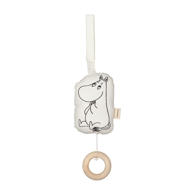 Musical alarm clock with Moomin print and wooden ring that plays Brahm's Lullaby for your child when you pull the string Contains organic cotton (License no. GOTS-CU-03-03580460) The product is FSC-labeled (Certificate no. NC-COC-066459)