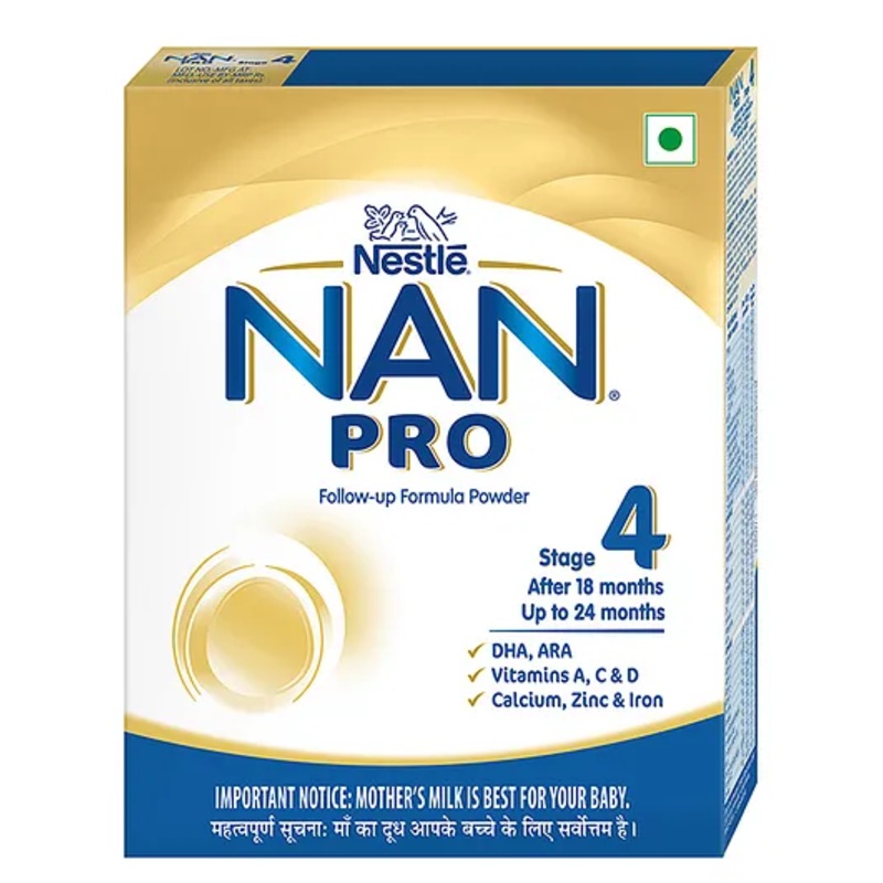 • Mother’s milk is the best for your babyIngredients“Milk solids, Maltodextrin, Soyabean oil, Low erucic rapeseed oil, High oleic sunflower oil, Coconut oil, Sunflower oil, Minerals, Emulsifier (Soya lecithin), Choline bitartrate, Arachidonic acid (ARA) from Mortierella alpina oil, Docosahexaenoic acid (DHA) from Schizochytrium sp. oil, Vitamins, Acidity regulators (Citric acid and Potassium hydroxide) and Packaging gases (Carbon dioxide and Nitrogen).INGREDIENTS AFTER RECONSTITUTION Water, Milk solids, Maltodextrin, Soyabean oil, Low erucic rapeseed oil, High oleic sunflower oil, Coconut oil, Sunflower oil, Minerals, Emulsifier (Soya lecithin), Choline bitartrate, Arachidonic acid (ARA) from Mortierella alpina oil, Docosahexaenoic acid (DHA) from Schizochytrium sp. oil, Vitamins, Acidity regulators (Citric acid and Potassium hydroxide) and Packaging gases (Carbon dioxide andNitrogen).Contains Milk, Soy.”Nutritional InfoComposition per 100g, Energy – 467 kcal, Protein- 14.1g, Carbohydrate – 59.9g, Total Sugars- 30g, Total Fat- 19g, Cholesterol – 10mgSpecificationsBrand – NestleType – Nan Pro 4 Infant FormulaRecommended Age – 18 Months+Weight – 24 x 400 gmProduct DescriptionNestl NAN PRO 4 is a spray dried follow-up formula with DHA, ARA, Vitamins A, C, D, Calcium, Zinc and Iron for infants after 18 months and up to 24 months when they are not breastfed. Nestl NAN PRO 4 contains DHA. DHA helps support normal brain development. Also contains Iron. Iron helps support normal cognitive development. Contains Vitamins A, C and Zinc. Vitamins A, C and Zinc contribute to normal immune system function. Contains Calcium and Vitamin D. Calcium and Vitamin D help support normal growth and development of bones. 155 years of expertise in Infant Nutrition Nestl develops infant nutrition products backed by evolving science and research. Innovation has been at the heart of Nestl since its beginning. Nestl agrees with the World Health Organization and other medical and health associations that breast milk is the best and the most natural food for babies. Important Notice Mother’s milk is best for your baby.Usage Directions Step 1 Wash your hands carefullyStep 2 Boil bottle, bowl and spoonStep 3 Boil drinking water and allow to coolStep 4 Consult feeding table, pour exact amount of previously boiled water into bottle. Please look for ml markings on bottleStep 5 Consult feeding table and add exact number of leveled scoops for age of baby. Shake bottle well to dissolve powderStep 6 Feed baby with bowl and spoon. Discard leftover feedStorage ConditionsOn opening, transfer the contents of the pack along with the pouch into a clean airtight container.After each use, replace lid tightly and store in a cool, dry and hygienic place.Warning & CautionUnboiled water, unboiled utensils or incorrect dilution can make your baby ill. Incorrect storage, handling, preparation and feeding can potentially lead to adverse effects for the health of your baby.Only prepare one feed at a time. Feed immediately and follow the instructions exactly. Boiled and cooled water shall be used to prepare this product and any leftover product must be discarded to reduce the risk of infection. Always hold baby while feeding. Leaving baby unattended may cause choking. Infant food should be used only on the advice of a health worker as to the need for its use and the proper method of its use. Infant food is not the sole source of nourishment of an infant. “Infant food shall be introduced only after the age of six months and up to the age of two years.”Consult your healthcare professional before introducing any new food to baby’s diet. If an earlier introduction of new foods is recommended by your healthcare professional, reduce formula intake as advised. Use only enclosed scoop. Do not change proportions without medical advice.Careful and hygienic preparation of infant milk substitute is most essential for health. Do not use fewer scoops than directed, since diluted feeding will not provide adequate nutrition needed by your infant. Do not use more scoops than directed, since concentrated feed will not provide the water needed by your infant. Retain the feeding table \ instructions given on this pack.Ensure enclosed scoop is washed and thoroughly dried before use. After opening use the contents within 3 weeks or the USE BY date, whichever is earlier.Important Notice Mother’s milk is best for your baby.Items Included in Package400 g Nan Pro 4 powderCustomer Care [email protected]; Toll Free Number1800-103-1947