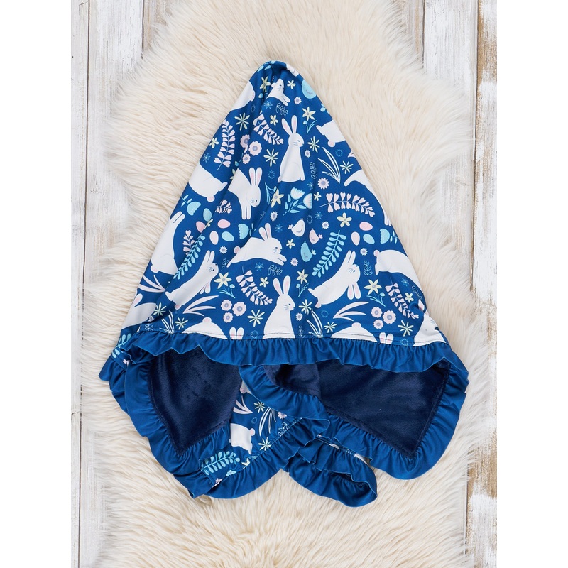 Hop into Easter with this playful Navy Bunny Leaps Ruffle Minky Blanket! The blue blanket features an adorable leaping bunny print, paired with ruffle details & minky backing for added charm. Perfect for a sibling set or just for your little one, this blanket from is a must-have for the holiday.