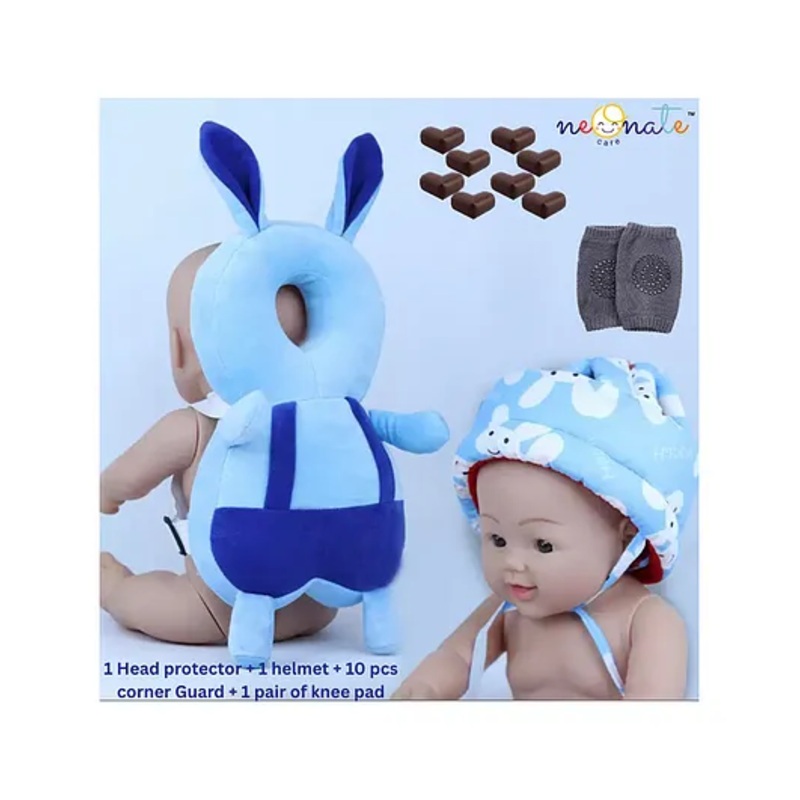 NeonateCare Baby Helmet(blue smiley helmet) Baby Head Protection Cushion Backpack(blue rabbit head protector)With Knee pad(multicolor) and 10 pcs corner guards (pack of 4 utility items)