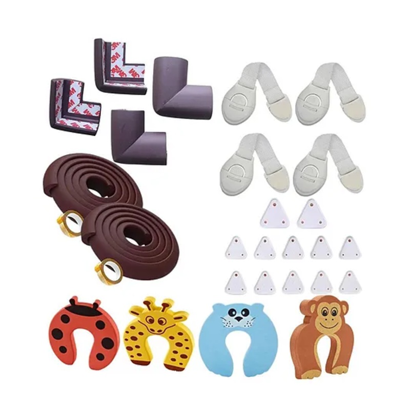 COMPLETE SAFETY KIT All-in-one baby proofing set includes 4-metre L shape edge guard, 4 corner guards, 4 door stoppers, 10 socket guards, and 4 child safety locks EDGE PROTECTION 4-metre long foam edge guard cushions sharp furniture edges and can be easily