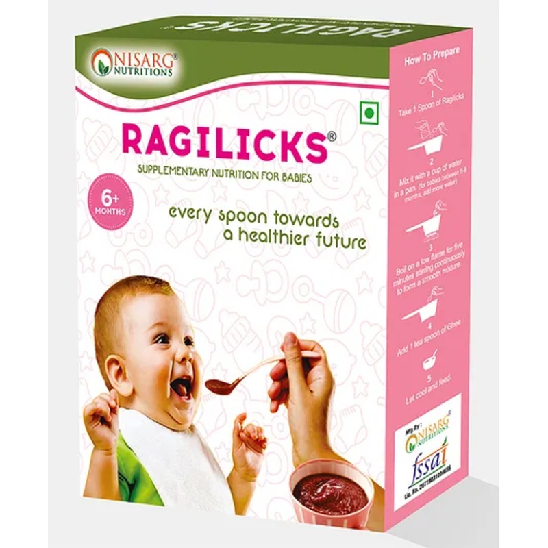No PreservativesNo Artificial Colors100% NaturalHigh in calcium and ironSpecificationBrand - Nisarg NutritionsType - Ragilicks PowderAge - 6 Months to 3 YearsQuantity - 408 gmProduct DescriptionsRagilicks is a 100% preservative free and excellent weaning f