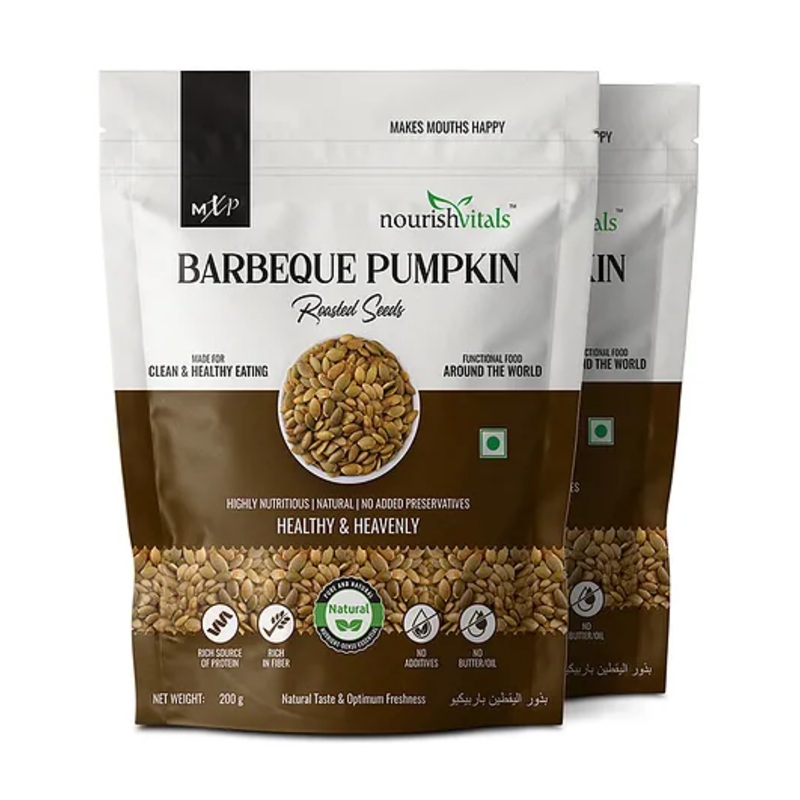 NourishVitals Barbeque Pumpkin Roasted Seeds make your mouth happy. The seeds are perfectly roasted to give a crunchy relish to your taste buds. Though roasted, the seeds have their healthy & tasty essence intact. The barbeque seasoning with salt, cornflour, sugar, smoke concentrate, garam masala, and citric acid makes the seeds distinctive and preferable. Give a unique touch to your daily routine pumpkin seed intake through this special pack to experience much more relish and delight. It even adds the veggie tastes of capsicum and spinach that enhance the savor of your snacks.Don’t let yourself miss this seed fun as it has highlighted nutritional and energy values and sources. The pumpkin seeds give superb high energy maintaining the calorie diet as well. With rich protein content, sufficient carbohydrates, and adequate dietary fiber, the tasty roasted seeds balance your healthy diet.This completely delightful pack is a great source of all the healthy nutrients required for your body. The seeds are delectable when taken alone or even when added to your tea, coffee, or snacks.All happies for foodies and health-conscious guys – the mouth-watering seed pack definitely fulfills your hunger and maintains the functional nutritional demands simultaneously.