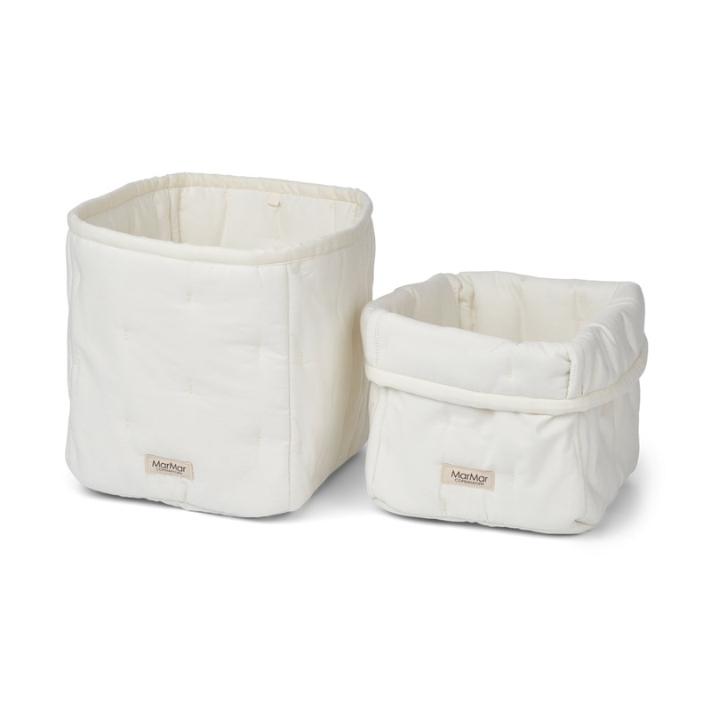 2 quilted baskets for changing supplies. The small one measures W:15cm x L:21cm x H:20cm. The large one measures W:17cm x L:25cm x H:20cm The product is Standard 100 by OEKO-TEX certified. This product contains organic cotton This product contains recycled