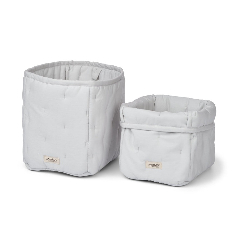 2 quilted baskets for changing supplies. The small one measures W:15cm x L:21cm x H:20cm. The large one measures W:17cm x L:25cm x H:20cm The product is Standard 100 by OEKO-TEX certified. This product contains organic cotton This product contains recycled