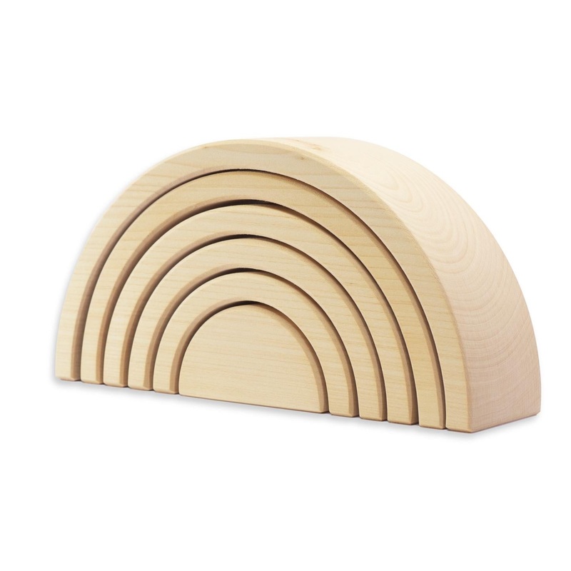 This item is used in Montessori education as a way to classify sizes. The rainbow allows for self-correction – finding the right spot for each arch through trial and error.