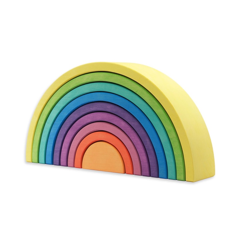 This item is used in Montessori education as a way to classify colors and sizes. The rainbow allows for self-correction – finding the right spot for each arch through trial and error.