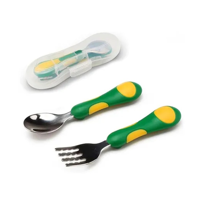 BPA-free, food-grade silicone handles with soft, anti-slip grip Rounded, smooth edges gentle on gums & first teeth Comes with BPA-free hygieneravel case to keep cutlery clean on the goSpecification Brand ONE AND ONLY Type Baby Feeding Spoon & Fork Set with Travel Case Materials 304 stainless steel (spoon & fork heads); BPA-free PP & silicone (handles and case) Dimensions (each utensil) L 14.5 cm B 3.5 cm H 1.5 cm (approx.) Recommended Age 6 months+ Safety Certifications LFGB & FDA compliant, non-toxic, phthalate-free Care Instructions Utensils are top-rack dishwasher safe; case should be hand-washed or wiped clean Color Green Net Quantity 2 pieces (1 spoon + 1 fork) + 1 travel caseProduct DescriptionMade from food-grade 304 stainless steel for the spoon and fork heads and BPA-free PP + silicone for the soft, anti-slip handles (case is BPA-free PP). Each utensil measures 14.5 cm (approx.) in length with a ~33.5 cm bowlyne width, suitable from 6 months+; utensils are top-rack dishwasher safe while the hygiene case is easy to wipe clean. The build is rust-resistant, odor\stain-resistant, LFGB & FDA compliant, with rounded, gum-safe edges that protect tender gums during early self-feeding. This Green training set includes 1 spoon + 1 fork + 1 BPA-free hygieneravel case, keeping cutlery clean in diaper bags, lunch boxes, and on the go.Item Included 1 x Stainless Steel Baby Spoon with Silicone Handle (Green) 1 x Stainless Steel Baby Fork with Silicone Handle (Green) 1 x BPA-Free Hygiene\Travel Case