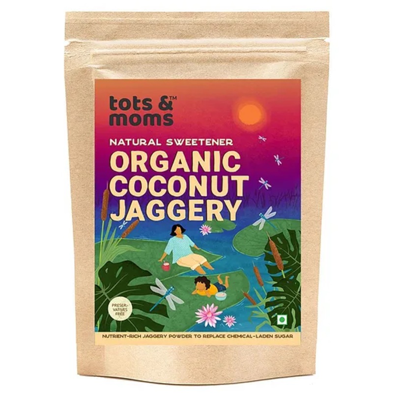 • SpecificationsBrand – Tots & MomsType – Organic Coconut JaggeryAge – 1 Year +Product Dimension – 21.84 x 12.09 x 4 cmIngredients100% Organic Coconut Jaggery. A total 100% and no junk added.Directions to useUse this Natural Sweetener in porridges, milk, juices, smoothies, sweet dishes, pancakes, cookies & cakesProduct DescriptionTots and Moms Coconut Sugar obtained from the sap of coconut plant is fresh, minimally processed and extracted via a two-step process. Considered a good alternative to white sugar, contains potassium, magnesium and sodium with a low-glycemic index. Because it is made from dehydrated coconut sap, it is considered a raw food and is rich in antioxidants. Prepared hygienically, Coconut sugar is good for the stomach, good fortifier, strengthens kids, builds immunity and keeps sugar in check. It can be enjoyed by both kids and adults sprinkled over foods or mixed into smoothies, pancakes, instant mixes and cereals.Items Included In PackageOrganic Coconut Jaggery 300gShelf Life & Storage InstructionsTots & Moms Coconut Jaggery Powder has a shelf life of 6 months. Once opened, store it in an airtight container and consume within a month. Can be refrigerated for longer shelf life.
