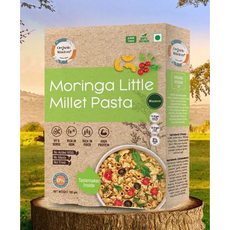 1. Rich Nutrition Profile – Rich in anti-oxidants & Vitamin B. No Maida, No refined oil, No added MSG, No preservatives, No food additives.2. Ingredients – Little millet flour, Whole wheat flour, Besan gram flour, Moringa leaves powderNet weight – 180 grams.3. It comes with a tastemaker – add it to your preferred spice level.4. Freshly packed – Shelf life of 12 months from the date of manufacturing.5. Millets are a better alternative to regular noodles\pasta as millets are the powerhouse of essential vitamins and macro and micro nutrients.6. Millets are known as harsh weather crops which means they need lesser water compared to rice, less water results in lesser use of pesticides making them organic in nature.7. Food is crafted using traditional methods like food as sun drying, which helps in keeping nutrients intact.SpecificationsBrand name – Organic WisdomType – Moringa Little Millet PastaAge – 12 Months +Quantity – 180 gramsProduct DescriptionIntroducing Organic Wisdom’s Moringa Little Millet Pasta, free from Maida, MSG, and unhealthy additives. Crafted with premium organic ingredients, solar-dried for wholesome nutrition. A delicious, guilt-free choice for your family’s well-being.Items Included In the PackageMoringa Little Millet Pasta along with Tastemaker.”