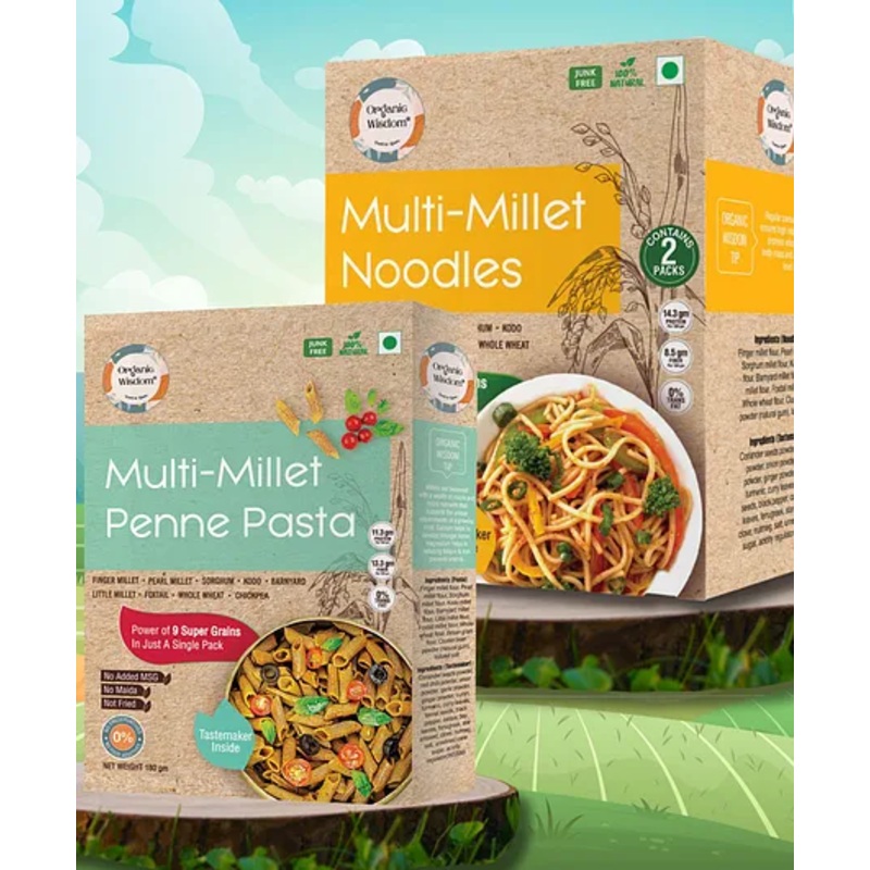 1. Rich Nutrition Profile – Rich in protein, calcium, Vitamin B, and fiber.2. No Maida, No refined oil, No added MSG, No preservatives, No food additives.3. Ingredients (Multi millet Penne pasta) – Finger millet flour, Pearl millet flour, Sorghum millet flour, Kodo millet flour, Barnyard millet flour, Little millet flour, Foxtail millet flour, Whole wheat flour, Besan gram flour.4. Ingredients (Multi millet Noodles) – Finger millet flour, Pearl millet flour, Sorghum millet flour, Kodo millet flour, Barnyard millet flour, Little millet flour, Foxtail millet flour, Whole wheat flour.5. Net weight – 384 gm (Noodles) & 180 gm (Pasta) | Comes with a tastemaker.6. Has a shelf life of 12 months, as each pack is freshly made and packed.7. Millets are a better alternative to regular noodles\pasta as millets are a powerhouse of essential vitamins and macro and micro nutrients.SpecificationsBrand name – Organic WisdomType – Multi millet Noodles & PastaAge – 12 months +Quantity – 564 grams, (384g noodles & 180g pasta)Product DescriptionIntroducing Organic Wisdom’s Multi-Millet Pasta & Multi Millet Noodles, free from maida, refined oil, MSG not-fried and unhealthy additives. Crafted with premium organic ingredients, it is sun-dried for wholesome nutrition. A delicious, guilt-free choice for your family’s well-being.Items Included In the Package2 Packets of Millet Noodles & 1 Packet of Pasta with Tastemaker”