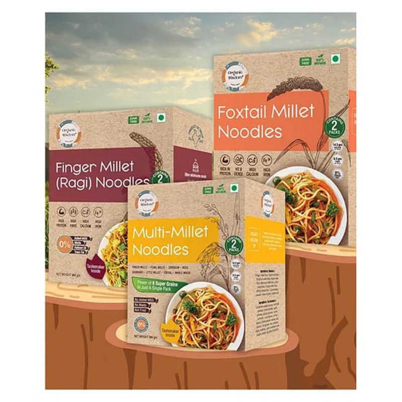 1. Ingredients – Multi Millet Noodles Finger millet flour, Pearl millet flour, Sorghum millet flour, Kodo millet flour, Barnyard millet flour, Little millet flour, Foxtail millet flour, Whole wheat flour, Cluster bean powder (natural gum), Iodized salt.2. Foxtail Millet Noodles Foxtail millet flour, Whole wheat flour, Cluster bean powder (natural gum), Salt.3. Ragi Noodles Finger Millet (Ragi) Flour, Whole wheat flour, Cluster bean powder (natural gum), Iodized salt.4. Tastemaker A blend of Ayurvedic spices for digestion and immunity.5. Tasty & Fun to Eat Delicious and slurpy, just like regular noodles, but much healthier.6. Stronger Muscles Packed with protein to help kids grow strong and activeSuper Bones & Teeth Ragi is rich in calcium, making bones and teeth strongerBrain Booster Foxtail millet has Vitamin B12, which helps in better memory and concentration.7. Energy Power provides long-lasting energy to play, run, and stay active all dayHappy Tummy Full of fiber for smooth digestion and no tummy aches.8. No Junk, Only Goodness Free from maida, MSG, artificial flavors, and harmful chemicals.9. Creative & Fun to Eat. Can be mixed with veggies, soups, or stir-fried for yummy variations.10. Good for the Planet Made from eco-friendly millets that use less water and no harmful pesticides.11. Shelf Life 12 months from the date of manufacturing.Specifications-Brand Name – Organic WisdomType – Multi Millet, Ragi and Foxtail NoodlesAge Recommendation – 12 Months +Quantity – 1152 gProduct DescriptionOrganic Wisdom’s Multi Millet, Ragi & Foxtail Millet Noodles offer a nutritious alternative to traditional maida noodles. Made from natural ingredients and solar-dried instead of fried, these noodles provide a healthier option for your family. They contain no maida, MSG, refined oil, trans fats, preservatives, or food additives. The ingredients used are of the highest quality and free from any residues. Multi Millet noodles are rich in Protein & Fiber, important for healthy muscles and faster repair of tissues post injury Foxtail millet is rich in Vitamin B12, essential for a healthy heart and nervous system, while Ragi is one of the best plant-based sources of calcium, vital for strong bones and teeth. These noodles are a great choice for those seeking both health and flavor. Enjoy a guilt-free, wholesome meal. Happy, healthy eating!Items Included In the Package1. Multi Millet Noodles (384g) contains 2 packs of 192g each + tastemaker.2. Foxtail Millet Noodles (384g) contains 2 packs of 192g each + tastemaker.3. Ragi Millet Noodles (384g) contains 2 packs of 192g each + tastemaker”