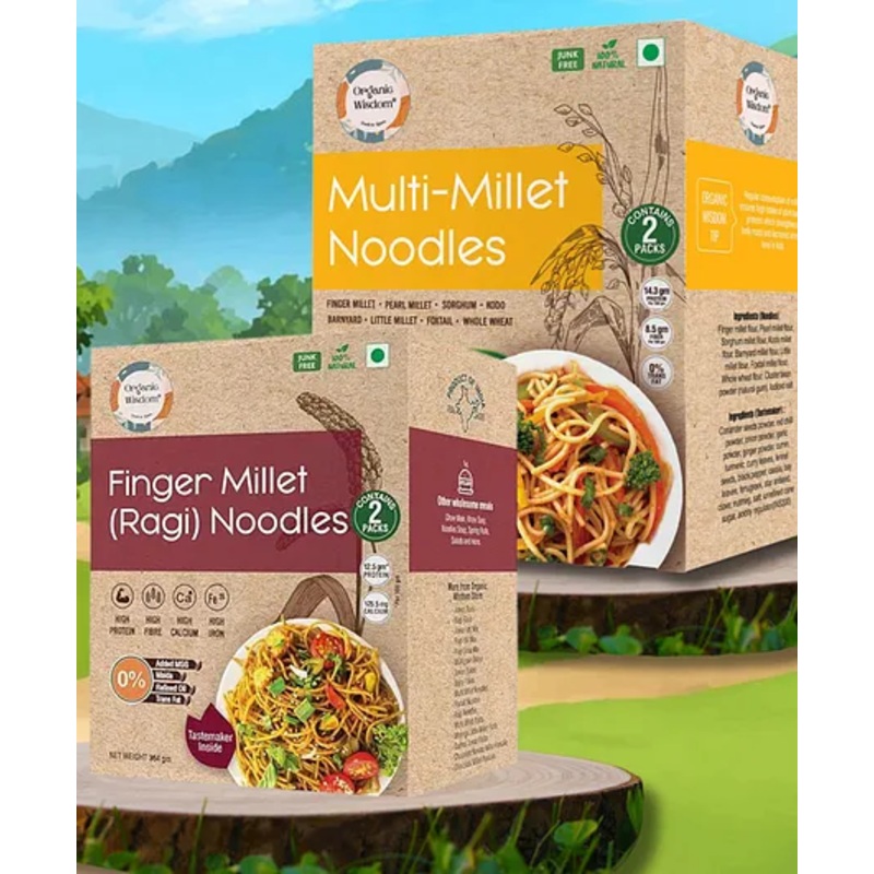 1. Healthy Millet Noodle Pack Ragi Noodles (384g) & Multi Millet Noodles (384g). Each box contains 2 packs of noodles inside – 192 g each, which comes along with a tastemaker.2. Millet noodles are a healthy choice, free from maida, MSG, refined oil, trans-fat, and food additives. These are made using traditional methods of solar drying to make them a healthier food choice.3. Ingredients are sourced from farmers who indulge in natural farming, and food is traditionally processed to keep the nutrients intact.4. Multi Millet Noodles Ingredients – Finger millet flour, Pearl millet flour, Sorghum millet flour, Kodo millet flour, Barnyard millet flour, Little millet flour, Foxtail millet flour, Whole wheat flour, Cluster bean powder (natural gum), Iodized salt.5. Ragi Noodles Ingredients – Finger Millet (Ragi) Flour, Whole wheat flour, Cluster bean powder (Natural Gum), and Iodized salt.6. Tastemaker – Curated from the blend of ayurvedic spices to help digestion and build immunity.7. Multi Millet Noodles are rich in protein and fiber, essential for building and repairing muscle, bone, and tissues. Ragi is the richest source of plant-based calcium, essential for stronger bones and teeth.8. Millets are known as harsh weather crops, which means they need less water compared to rice; less water results in less use of pesticides, making them organic in nature.9. Freshly packed – Shelf life of 12 months from the date of manufacturing.SpecificationsBrand name – Organic WisdomType – Multi Millet & Ragi NoodlesAge – 12 months +Quantity – 768 gramsProduct DescriptionOur carefully crafted combination of Multi-Millet Noodles and Ragi Noodles offers a unique and delicious taste experience while prioritizing your health and the environment. By choosing our combo, you will not only enjoy a delightful taste and texture but also support environmentally friendly farming and healthy eating. Indulge in the goodness of our Organic Wisdom Combo, where quality, taste, and nutrition come together in perfect harmony.Items Included In the Package1. 2 Packs of Multi-millet noodles with tastemaker2. 2 packs of ragi noodles with a tastemaker”