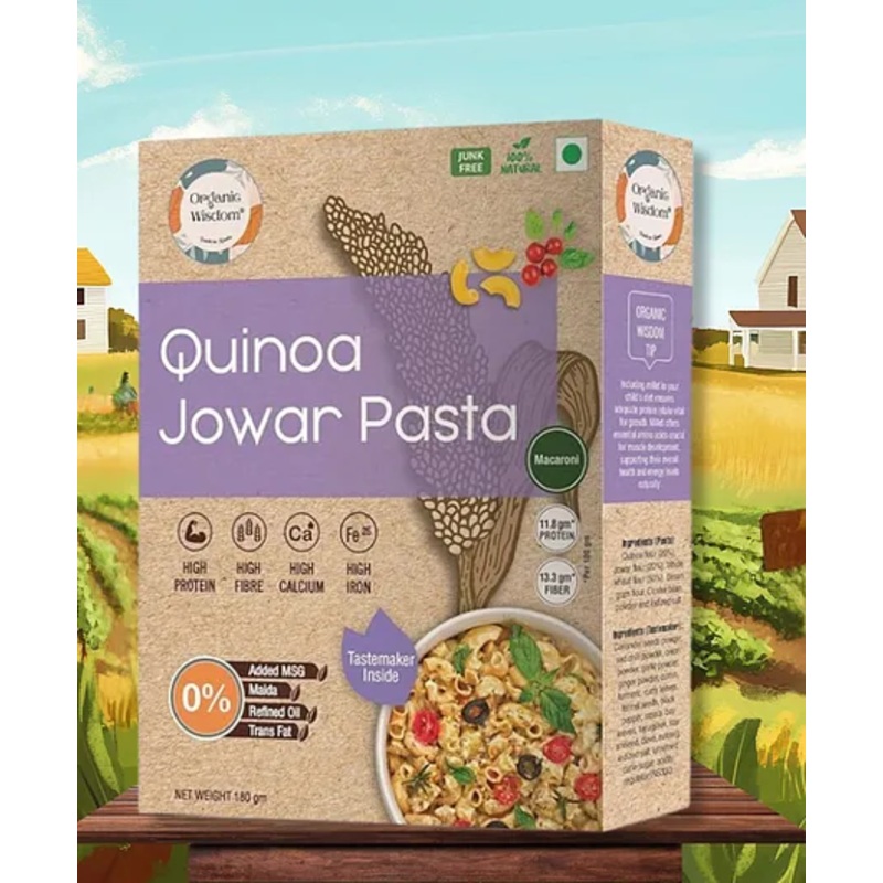 1.Rich Nutrition Profile – Quinoa & Jowar are one of the richest source of plant based protein. Millet Pasta is rich in protein, fiber, anti-oxidants & Vit B.2.Ingredients – Quinoa flour, Jowar flour, Whole wheat flour, Besan gram flour, Cluster bean powder and Iodized salt. Ingredients are sourced from the farmers indulge in natural farming and food is traditionally processed to keep the nutrients intact.3.Tastemaker – Curated from the blend of ayurvedic spices to help digestion and build immunity.4. Millet pasta is a healthy choice, free from maida, MSG, refined oil, trans-fat, food additives. These are made using traditional methods of sun drying making them a healthier food choice.5.Net weight – 180g (tastemaker inside, which can be added as per the preferred spice level)6. Millets are known as harsh weather crops which means they need lesser water compared to rice, less water results in lesser use of pesticides making them organic in nature.7.Freshly packed – Shelf life of 12 months from the date of manufacturing.SpecificationsBrand name -Organic WisdomType – Quinoa Jowar Macaroni pastaAge – 12 + MonthsQuantity – 180 grams.Product DescriptionNutrient-rich benefits of Quinoa and Jowar, making it super healthy & junk free alternate to regular pasta options. Rich in protein and fiber, it offers a unique flavour profile, catering to those seeking a nutritious and delicious food profile. While preparing Organic Wisdom’s Quinoa Jowar Macaroni Pasta, no chemicals, preservatives, food additives, maida or refined oil is used. It’s curated with love in heart and health in mind to satisfy your food cravings in a healthy way.Items Included In the PackageQuinoa Jowar Macaroni Millet Pasta along with tastemaker.”