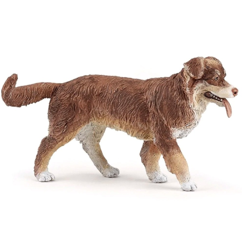 This hand-painted dog figure is sculpted in a walking position with four alternating legs, a swaying tail and tongue sticking out. The Papo dog has long fur and floppy ears distinctive to the Australian Shepherd breed.Papo 54038 Australian Shepherd, Releas