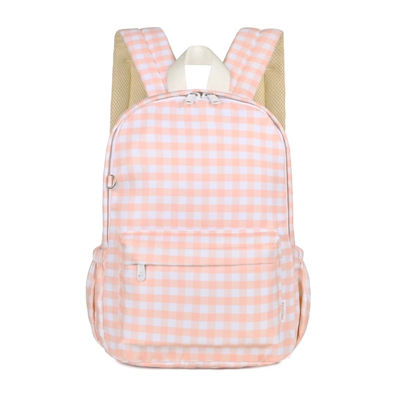 A classic sweet gingham print in a soft peach/pink and one of ourbest selling prints!Our Pink Gingham mini backpack isthe perfect size for daycare/kindy - it fits a small lunch box, sheet, drink bottle and spare pair of clothes perfectly and is perfectly s