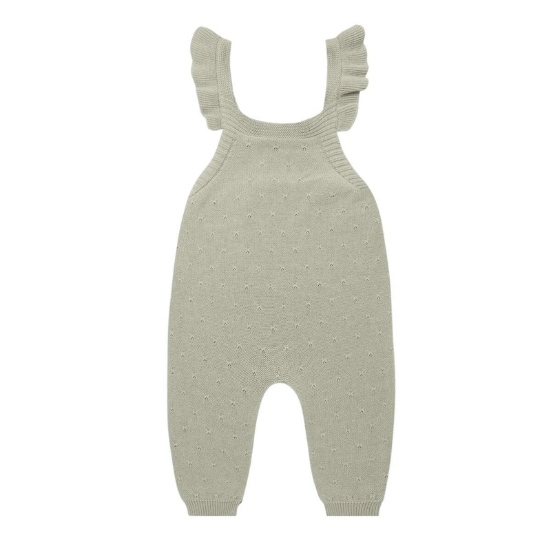 Pointelle knit overalls in the softest sweater knit with adjustable button straps and a ruffle detail at the sleeve.Colors:PistachioCare: Machine wash. Tumble dry low.Made of 100% Organic Cotton