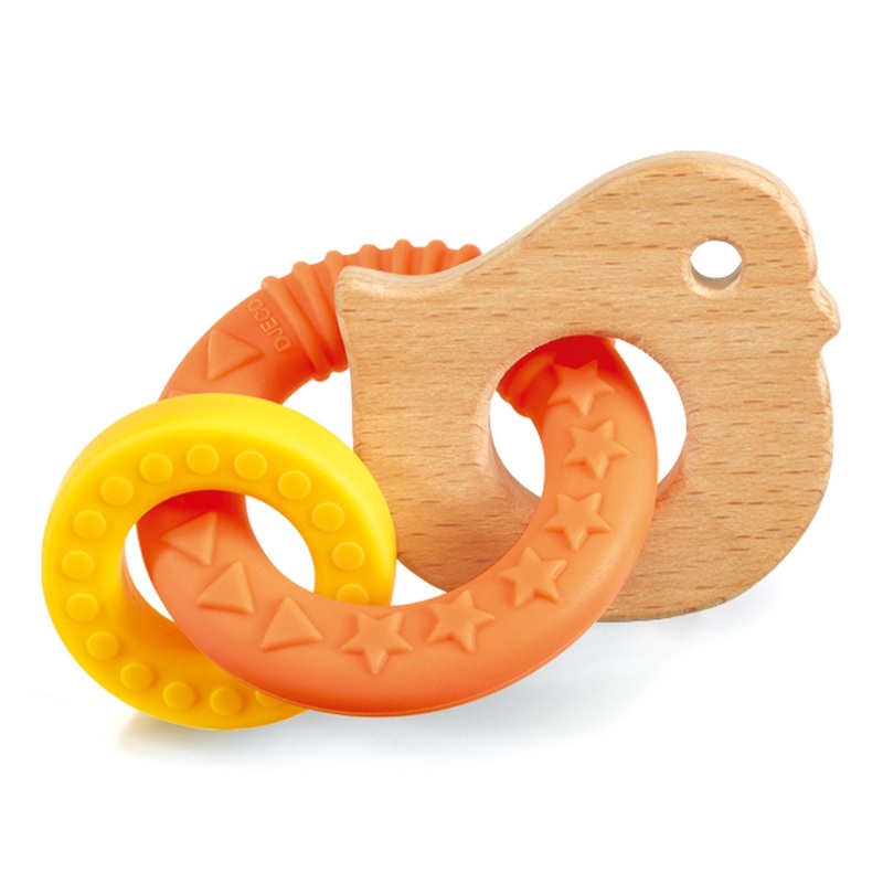 Contents: 1 beech wood bird attached to 2 silicone rings (1 large and 1 small).