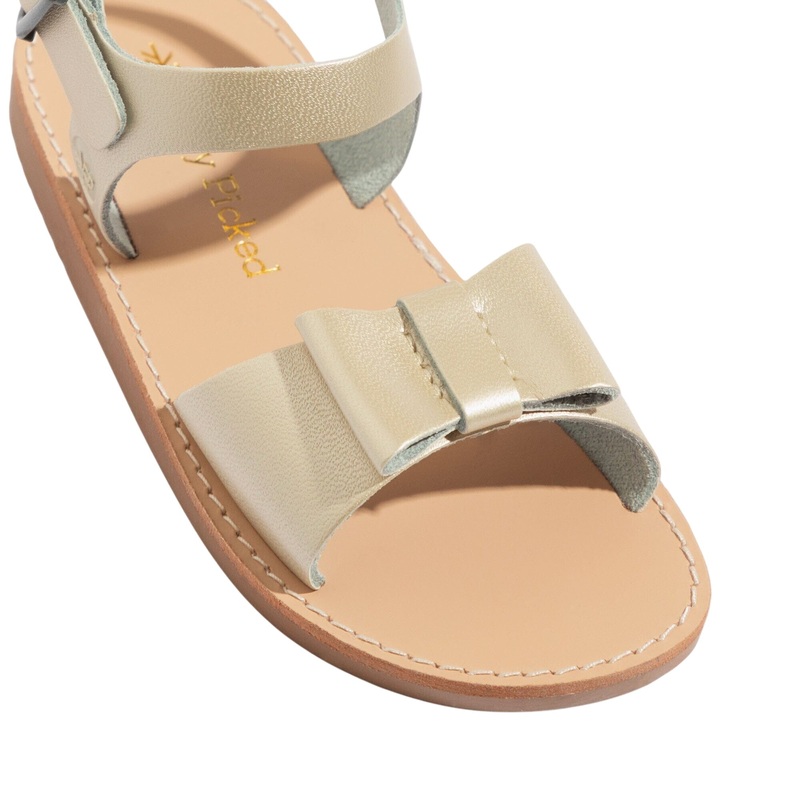 Prepare your little ones for sunny days with the upgraded design. Crafted from genuine leather, offering a luxurious feel and durability. Custom Italian prong-free buckle ensures a hassle-free on-and-off experience. Cute bow detail blends style with a secu