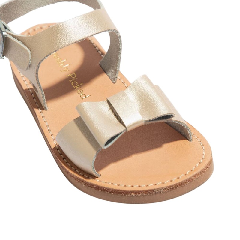 Introducing our newest sandal in Platinum. Features a leather T-strap upper with a cute bow on top! Offers prong-free Italian buckles that are easy to put on and take off. Includes a soft leather insole for added comfort. Equipped with a cushioned rubber s