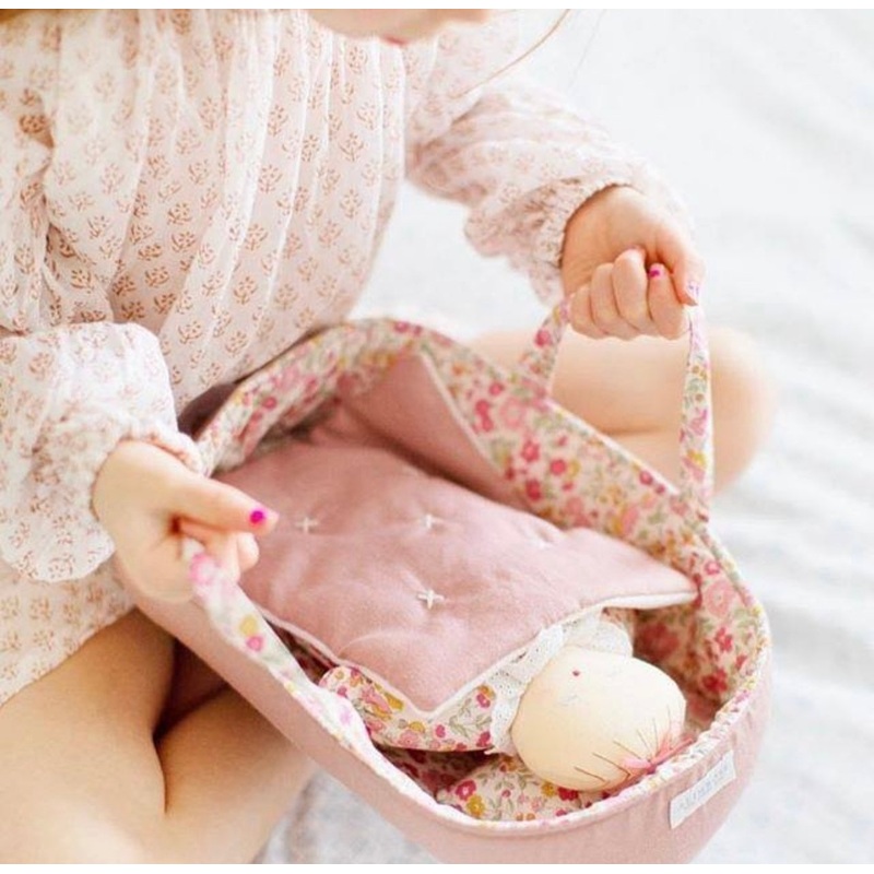 A sweet reversible fabric nesting basket with a mini quilt and pillow. Perfect for any baby doll. Approx 30cm long. Suitable 2yrs.Features:Cotton and poly cotton outerwith all new fibre fill innerSoft floral pillowCute blush and buttery fleece quiltSpot cl