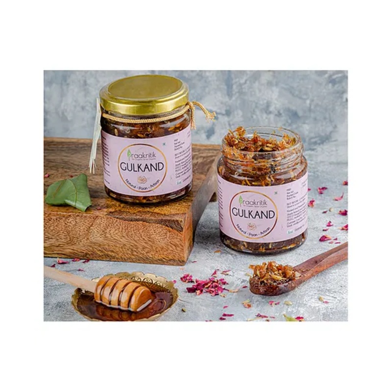 • It can boost the gut bacteria and help get rid of acne marks as well.IngredientsDamask rose petals, betel leaves, elaichi, honey, mishri (rock sugar)SpecificationsBrand – PraakritikType – Paan gulkandQuantity – 250 gmProduct DescriptionGulkand has antibacterial and antiviral properties that can remove toxins from the body to purify the blood, which is very important during pregnancy. Moreover, toxin-free blood can give you glowing and acne-free skin. Our Indian Damask pink rose comes from the foothills of Pushkar, Rajasthan. We use autumn bloomed rose petals which bloom twice a year. This Gulkand is made from fresh rose petals and mishri (unrefined form of sugar) which has its own medicinal values. All the ingredients are combined and cooked in the sun taking 50-60 days to make this Artisanal gulkand with maximum nutritional benefits.Items Included in the Package1 jar of 250 gm gulkand