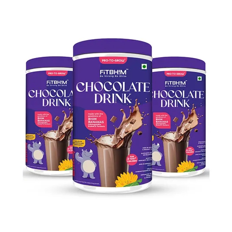 1. Nutritious Chocolate Drink for Kids FitBhim Chocolate Drink is a wholesome nutrition drink designed to support growth, immunity, and overall well-being. It helps boost energy, enhance stamina, and promote healthy development in growing kids.2. Superfood Ingredients Made with Bhim Banana, Skimmed Milk Powder, Turmeric, Brahmi Extract, Ashwagandha Extract & Cocoa for natural energy & nourishment.3. Supports Growth & Immunity Helps in height & weight gain, strengthens bones, enhances stamina, and aids digestion, making it ideal for growing kids.4. Natural & Wholesome Made without artificial additives, it provides high-quality protein, boosts metabolism, and supports overall health with natural goodness.5. Versatile Usage Mix with warm or cold milk for a delicious drink, blend into smoothies, porridges, or desserts to add a nutritious twist to daily meals.SpecificationsBrand – Pro-To-GrowType – Nutrition DrinkProduct Dimension – L 19.5 x B 19.5 x H 19.5 cmNumber of Pieces – 3Product DescriptionWith FitBhim Chocolate Drink, we bring to you the goodness of Bhimkol along with Ayurvedic Herbs i.e. Brahmi, Ashwagandha & Turmeric. It is formulated to give a dose of uncompromising nutrition and immunity to everyone. It is not a health supplement; FitBhim is a product synonymous with health. A product keeps you close to nature while you enjoy great health and immunity, which is the need of the hour too. Fitbhim Chocolate Drink is a ready-to-eat powder that can be consumed directly from the jar, made into a smoothie with or without milk. Fitbhim is a nutritional supplement that provides complete, balanced nutrition, during those special years of rapid growth and development. It has a perfect blend of all vital nutrients along with the added advantage of Bhim banana, Brahmi, ashwagandha, and turmeric. It is designed with an enhanced taste for fussy eaters to take care of Nutritional deficiencies and helps support their overall growth and development. Fitbhim enjoys the trust of mothers and doctors. Made with real natural BhimKol banana. BhimKol banana is the most nutritious banana species. It helps in increasing overall well being. Boost Immunity Contains Copper, Vitamin A,C,E B6, B9 and Turmeric Extract. Fitbhim chocolate is suitable for growing kids and is a complete & balanced nutrition for growing kids. Fitbhim with all essential Vital Nutrients Including Carbohydrate, Protein, Fat, Vitamins, Minerals. It is also Formulated with all essential Nutrients along with Ayurvedic Herbs (Ashwagandha, Brahmi and Turmeric), DHA, Prebiotics, Probiotics and Stevia. Fitbhim ensures Height and Weight Gain as it contains Energy, Protein, Fat, Carbohydrates, Phosphorus, Zinc Sodium and Chloride; Enhances Stamina through Vitamin B12, Iron and Ashwagandha. It fosters Brain Development as it has Magnesium, Vitamin B1, B2, B3, B5 and B7, Potassium, Brahmi and DHA.Items Included In the Package3 Jars of Nutrition Drink (200 g) each & 1 Sipper.