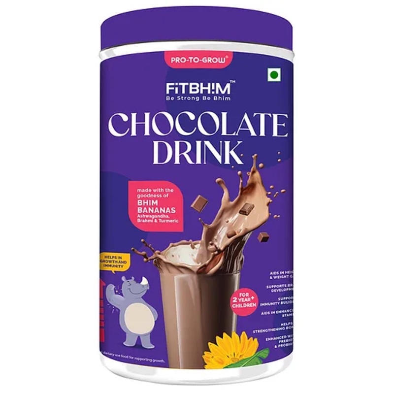 1. Nutritious Chocolate Drink for Kids FitBhim Chocolate Drink is a wholesome nutrition drink designed to support growth, immunity, and overall well-being. It helps boost energy, enhance stamina, and promote healthy development in growing kids.2. Superfood Ingredients Made with Bhim Banana, Skimmed Milk Powder, Turmeric, Brahmi Extract, Ashwagandha Extract & Cocoa for natural energy & nourishment.3. Supports Growth & Immunity Helps in height & weight gain, strengthens bones, enhances stamina, and aids digestion, making it ideal for growing kids.4. Natural & Wholesome Made without artificial additives, it provides high-quality protein, boosts metabolism, and supports overall health with natural goodness.5. Versatile Usage Mix with warm or cold milk for a delicious drink, blend into smoothies, porridges, or desserts to add a nutritious twist to daily meals.SpecificationsBrand – Pro-To-GrowType – Nutrition DrinkProduct Dimension – L 19.5 x B 10 x H 10 cmNumber of Pieces – 1Product DescriptionWith FitBhim Chocolate Drink, we bring to you the goodness of Bhimkol along with Ayurvedic Herbs i.e. Brahmi, Ashwagandha & Turmeric. It is formulated to give a dose of uncompromising nutrition and immunity to everyone. It is not a health supplement; FitBhim is a product synonymous with health. A product keeps you close to nature while you enjoy great health and immunity, which is the need of the hour too. Fitbhim Chocolate Drink is a ready-to-eat powder that can be consumed directly from the jar, made into a smoothie with or without milk. Fitbhim is a nutritional supplement that provides complete, balanced nutrition, during those special years of rapid growth and development. It has a perfect blend of all vital nutrients along with the added advantage of Bhim banana, Brahmi, ashwagandha, and turmeric. It is designed with an enhanced taste for fussy eaters to take care of Nutritional deficiencies and helps support their overall growth and development. Fitbhim enjoys the trust of mothers and doctors. Made with real natural BhimKol banana. BhimKol banana is the most nutritious banana species. It helps in increasing overall well being. Boost Immunity Contains Copper, Vitamin A,C,E B6, B9 and Turmeric Extract. Fitbhim chocolate is suitable for growing kids and is a complete & balanced nutrition for growing kids. Fitbhim with all essential Vital Nutrients Including Carbohydrate, Protein, Fat, Vitamins, Minerals. It is also Formulated with all essential Nutrients along with Ayurvedic Herbs (Ashwagandha, Brahmi and Turmeric), DHA, Prebiotics, Probiotics and Stevia. Fitbhim ensures Height and Weight Gain as it contains Energy, Protein, Fat, Carbohydrates, Phosphorus, Zinc Sodium and Chloride; Enhances Stamina through Vitamin B12, Iron and Ashwagandha. It fosters Brain Development as it has Magnesium, Vitamin B1, B2, B3, B5 and B7, Potassium, Brahmi and DHA.Items Included In the Package1 Nutrition Drink (200 g)