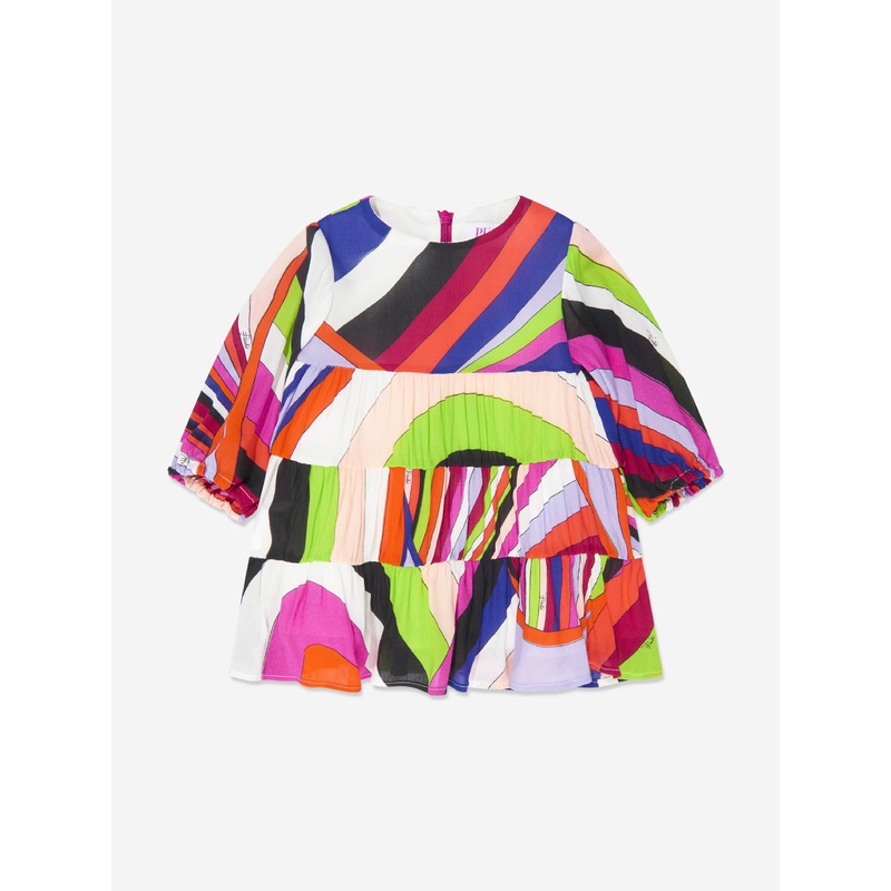 Exhibiting energy and joy, this baby girls dress from Pucci showcases the label's iconic iride print on a maximalist scale. The multi-coloured, all-over print piece is crafted from a soft, lightweight fabric, the tiered dress features zip fastening on the