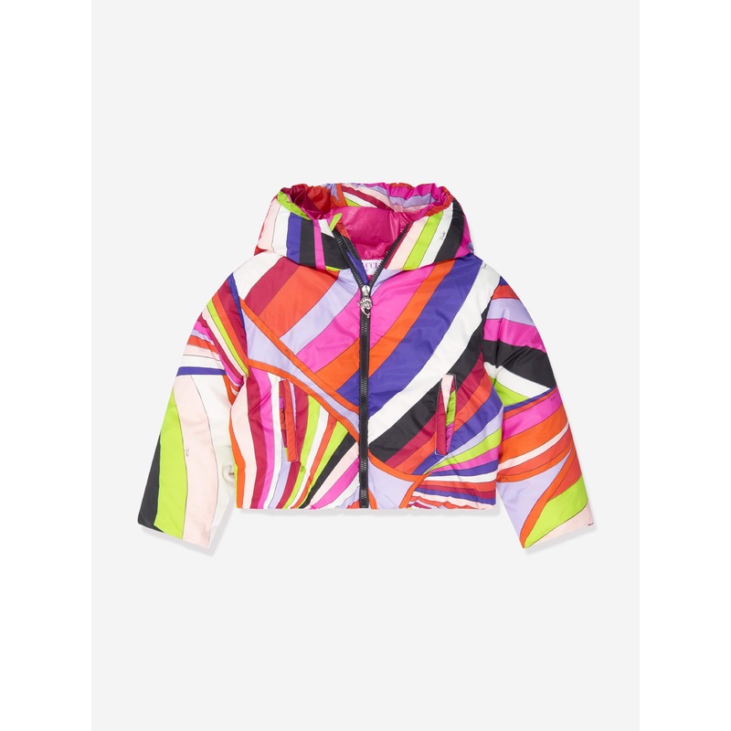Dress joyfully whatever the weather with this girls multi-hued puffer jacket from Pucci. Decorated with the Italian label's mesmeric iride pattern, ribbons of colour glide across the warm, comfy down filled piece. A cropped silhouette adds a feminine touch