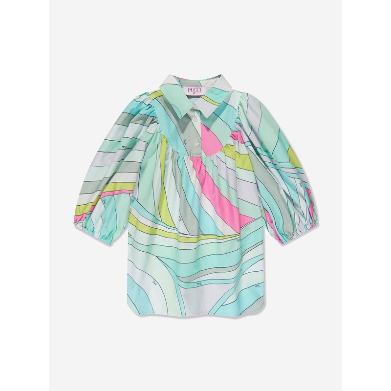 Dress joyfully with this girls pastel-hued shirt-dress from Pucci. Decorated with the Italian label’s mesmeric iride pattern, ribbons of colour glide across the soft, cool cotton canvas. Stylish and versatile, the vibrant outfit is the perfect piece for statement dressing this season.