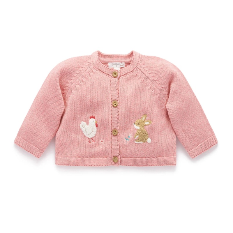 Our Easter Cardigan is the perfect layering piece to add to her winter wardrobe. Lovely and soft, featuring a sweet fluffy chicken and bunny applique, made from an organic cotton wool blend in a textured stitch. Layer over our Gingham Bunny Dress for a pre