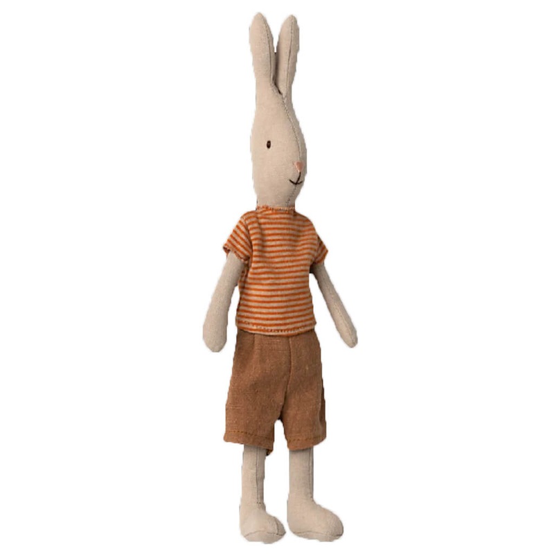 A classic rabbit made of soft natural linen and cotton fabric that gives a lovely hand feel and look. This adorable rabbit doll wears a classic striped t-shirt and brown shorts.Recommended age: All agesMaterial: Linen/Cotton; Filling: Recycled polyester/PE