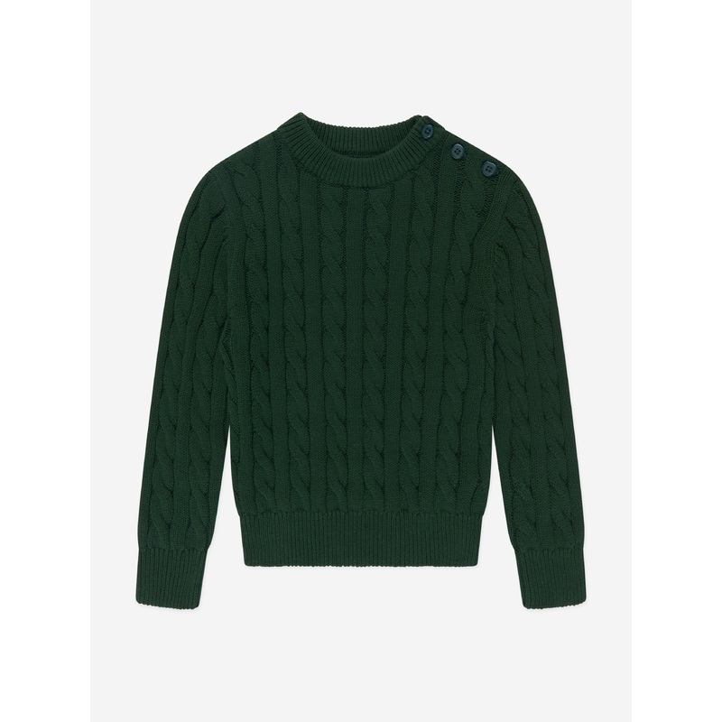 Rachel Riley contemplate 50s and 60s vintage archives into fresh perspectives. This boys green cable knit sweater is reflective of the British label's sleek majestic craftsmanship. Made in refined knit with three buttons across the left shoulder and ribbed