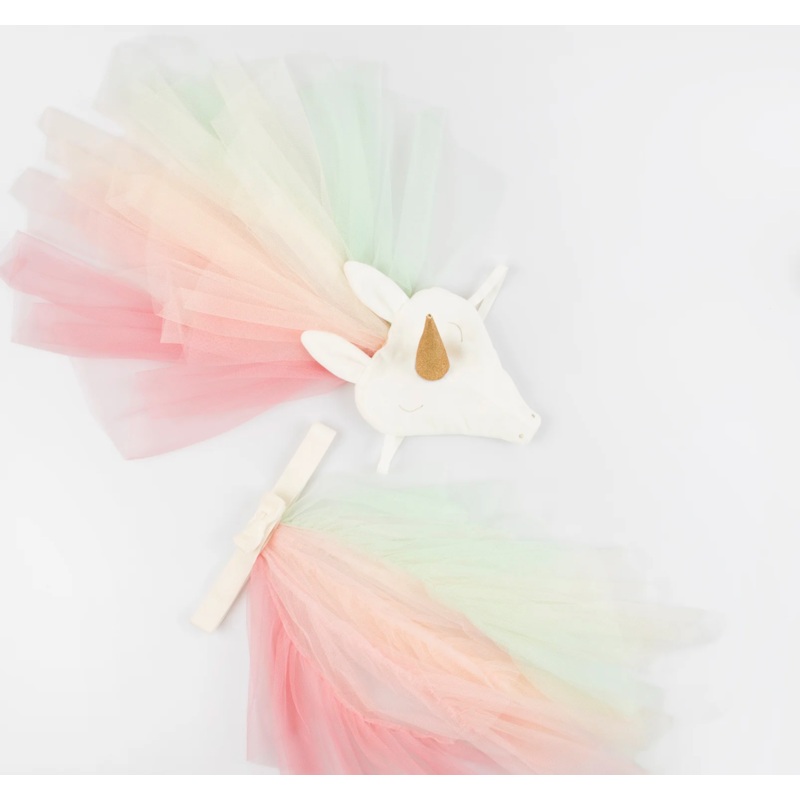 Unicorns are magical! Bring these mythical creatures to life with our 2 piece dress up set. It features a velvet unicorn headpiece with a glitter fabric horn and embroidery, and a velvet waist band with a colorful tail. The mane and tail have lots of layers of vertical sewn tulle in rainbow colors. A truly magic outfit to wear to parties or for hours of imaginative play and fun.