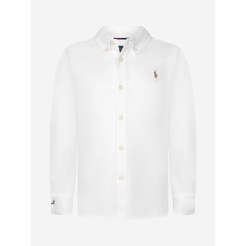 Introducing the Ralph Lauren Boys White Cotton Pique Oxford Shirt from Ralph Lauren Kids in Brown. This stylish shirt is perfect for boys during their daily adventures. Here are the key features that make it a must-have:
