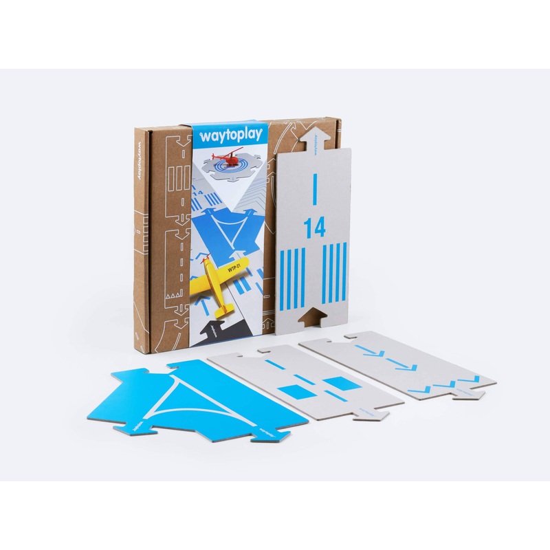 The recycled cardboard runway and airport parts are specially designed for indoor use and they offer an extra benefit: kids can write or doodle on the back.The Runway is a great addition to the cardboard series. Fourteen recycled cardboard parts with blue screen printed graphics have typical markings that can be seen on airports, like taxiways, take-off and landing strips, gateways and a helicopter pad.We added four newly designed shapes that make them a great addition to the range of waytoplay toys.