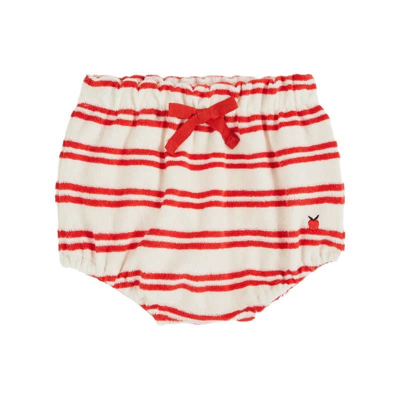 Red terry bloomer with white stripes. Made from ultra-soft, fluffy, stretchy terry velvet, it offers unrivalled comfort. A little bloomer with elasticated waistband and thighs. A red cotton twill bow, just decorative, enlivens the waistband, as does the little red apple embroidered on one side.