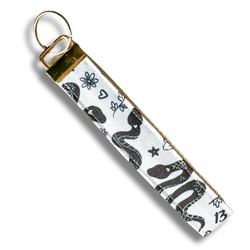Calling all Swifties! This pattern is inspired by Reputation! Wristlet keychains feature unique fabric patterns hand drawn by us and exclusive to Oak Shore that are sure to make a statement! Our keychains are not only practical for keeping your keys secure