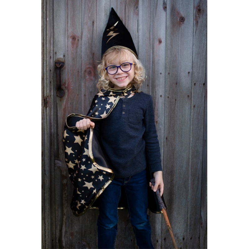 This reversible wizard cape is the perfect wizarding cape. Fight the evil dark wizard in style with this 2 piece cape set and pointed hat. A golden lightning bolt is featured on the black satin side and reverses to a sea of golden stars on black satin. The wizard hat features a soft elastic chin strap to keep your hat in place while casting spells and a large matching bolt for extra magical powers. Proudly made in Canada.