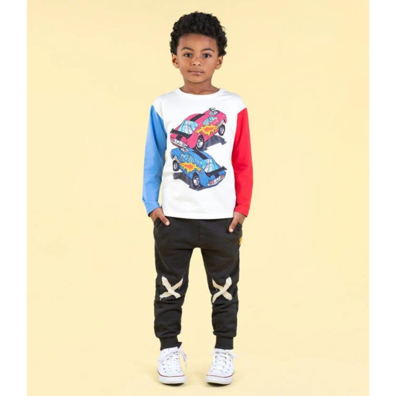 Introducing our Cars Long Sleeve T-Shirt! Made from 95% cotton and 5% elastane jersey, this boxy, looser fit t-shirt features ribbing across the neck, a curved back hem, and contrast set in long sleeves in red and blue. The cream base features a front prin