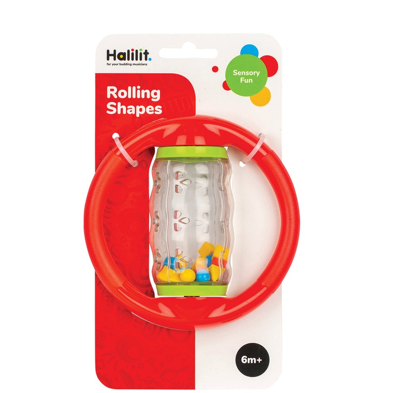 Experience the fun of rolling and rattling with the Halilit Rolling Shapes! This transparent spinning tube is filled with vibrant geometric beads that create delightful sounds when shaken or spun. Designed with two user-friendly handles, it's perfect for l