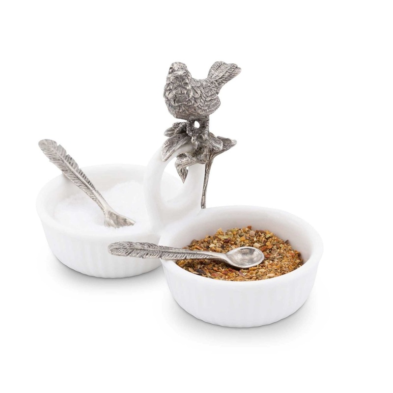 A petite pewter songbird perches on the handle of this Song Bird Double Salt Cellar. The double salt or spice cellar is crafted from fine stoneware. The handle of each pewter spoon is imagined as a tiny quill feather.Each side will hold a generous Tablespo