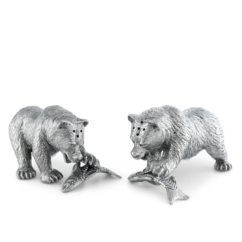 The extraordinary detail in these Fishing Bears Pewter Salt and Pepper Set is due to the amazing versatility of pewter. Created with cast, hand finished pewter this set is a captivating example of the artisanship by designers.Perfect for entertaining in yo