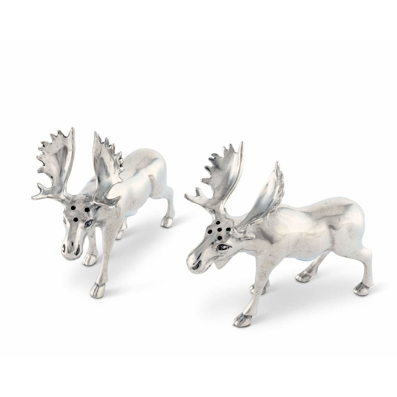 Complement your cabin-themed serve ware with this Moose Salt and Pepper Set. Crafted in luxury-grade pewter, this set features two moose looking off towards the forest as they walk along your table. The smooth body of each creature accentuates their distin