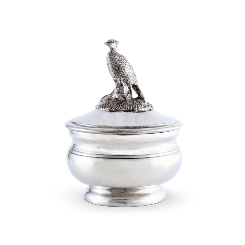 A finial of an exquisitely detailed female pheasant stands atop her nest on the lid adding unique style as a figural handle. The bowl is sparely tooled in classic style cast with a slight indent curve near the top and a round stacked ring base. The cover ensures that your sauce will stay fresh and the conductive properties of pewter ensure that a cool sauce will be cool and a warm one will stay warm for your entire meal.