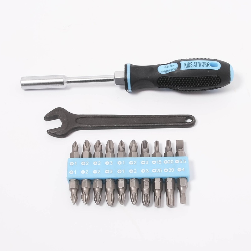 Children's Screwdriver combination set with 20 different attachments and one spanner included.Magnetic tip, 20 magnetic bits.10.5mm spanner serves as lever.This is not a toy.Part of the Kids at Work range by Corvus