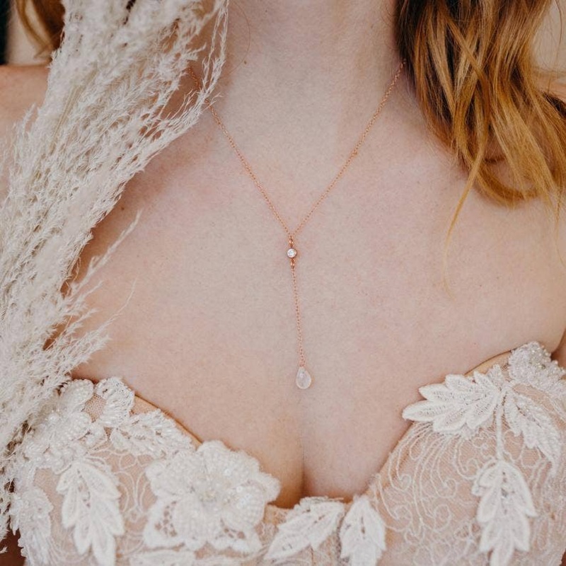Our SKYE Moonstone Necklace is so dainty & beautiful! This dainty lariat necklace is made for the minimalist lovers who want something that they can wear on their special day without overpowering their entire look. The eye-catching cubic zirconia and rainb