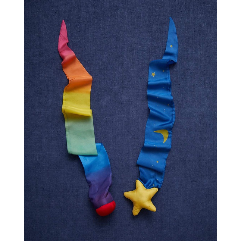Rainbow Comet is a red stuffed ball with a rainbow silk tail.