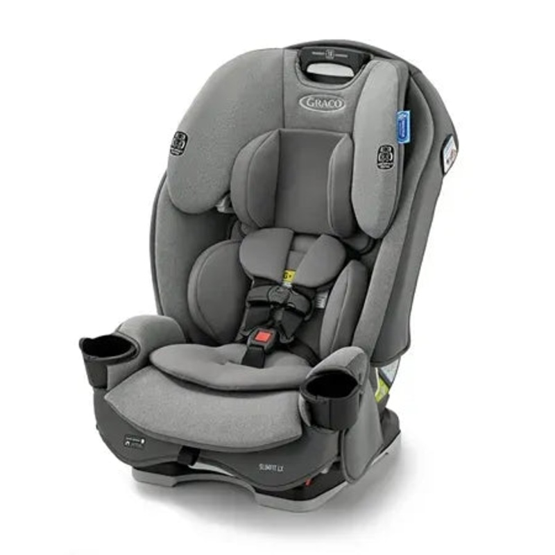 The Graco SlimFit LX 3-in-1 Car Seat grows with your child, from rear-facing harness (5-40 lb) to forward-facing harness (22-65 lb) to highback booster (40-100 lb). The slim car seat saves space in your back seat and includes pockets for extra storage, while giving your child plenty of room to grow. The unique rotating cup holders simply rotate away, making the seat 10% slimmer to save precious back seat space, while myPocket keeps the things your child would want within reach. The Simply Safe Adjust Harness System means you can easily adjust the harness and headrest together to accommodate your growing child with ease. Plus, the Rapid Remove cover quickly and easily removes for cleaning. You can keep your child comfortable with 4 recline positions, while the InRight LATCH system makes installation easy with a one-second attachment. The seat is Graco ProtectPlus Engineered to help protect your little one in frontal, side, rear, and rollover crashes.